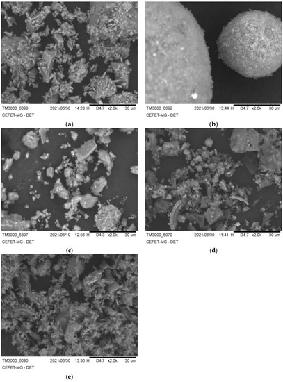 The analysis of the particle morphology of each material was performed using SEM and is presented in Figure 2. The scanning electron microscopy was performed on a Hitachi TM3000 scanning electron microscope under a low vacuum with a backscattered electron detector and electron acceleration voltage of 15 kV.