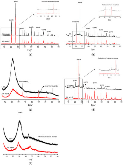 Lancellotti et al. [38] studied the reactivity of bottom ash. After a chemical attack with 100 mL of 8 mol/L NaOH solution and stirred constantly for 5 h in a flask bathed at 80 °C, it concluded that the ashes were not adequate to obtain a geopolymer since its Si/Al mass ratio were below the value of 3. Kuenzel et al. [36] studied the reactivity of metakaolin through 1% (mass) HF solution for 20 h at ambient temperature and concluded that HF removes the amorphous phase in MK associated with the intensity background between 20 and 30 degrees 2θ, with the remaining sample consisting of crystalline phases present as impurities and the Si/Al mass ratio after acid attacks is equal to 2.85. Fernández-Jimenez et al. [37] studied the reactivity of fly ashes through 100 mL of 1% HF stirred for 6 h at ambient temperature and concluded that when the ashes are treated with 1% HF, most of the halo associated with its glassy constituent disappears. At the same time, these diffractograms evidence an increase in the intensity of the peaks associated with the crystalline phases. The precursors evaluated in this studied (SF, MK, BFS, SCBAM and SCBAMH) exhibits the same behavior of work of Fernández-Jimenez et al. [37].
