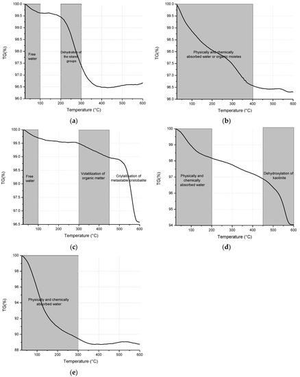 Besides that, MK also exhibits a low mass loss value at about 6% (Figure 4d). This also suggests that the presence of stable crystalline phases in these materials, such as quartz and kaolinite, reduces the mass loss degree. However, MK shows a higher loss of mass that SF, SCBAM and SCBAMH as a result of the dihydroxylation of kaolinite that occurs around 450–600 °C [82,83]. At the same time, BFS exhibits weight loss of 12% in the range of 25–300 °C, assigned to the release of physically or chemically adsorbed water. Usually, the removal of hydroxyl groups depends on their chemical bonding with metal ions. Non-coordinating hydroxyl groups or physically adsorbed water molecules are removed at a lower temperature [84].