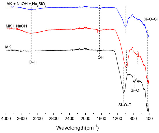 The presence of hydrated products is related to the presence of O-H bond at around 3400 cm−1 in activated pastes, as observed for MK-pastes (Figure 6). In addition, there is the presence of OH bond assigned to the band around 1700 cm−1 in these pastes which is also associated with the formation of hydrated products. The intensity of these bands could be attributed to the effective activation of the precursor. In addition, there is also the presence of the Si-O-T bond in activated pastes, and it shifted to lower values in the precursor. This change in wavenumber is attributed to the introduction of aluminum on silicon bond for N-A-S-H formation which is a characteristic product of polymerization of low calcium precursor [93,94].