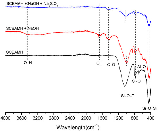 Figure 7 shows the FTIR spectrum of SCBAM and SCBAMH activated pastes. In the SCBAMH pastes, only the paste activated with sodium hydroxide exhibits the hydrated products, however, the bands associated with these products are not significant. In addition, the bands assigned to C-O-C, Si-O-T, Si-O, and Si-O-Si bonds exhibit similar behavior to MK. However, at the FTIR spectrum of the pure precursor, it is possible to observe a band around 700 cm−1 associated with the Al-O bond which decreases the intensity after activation due to the precursor dissolution [95,96].