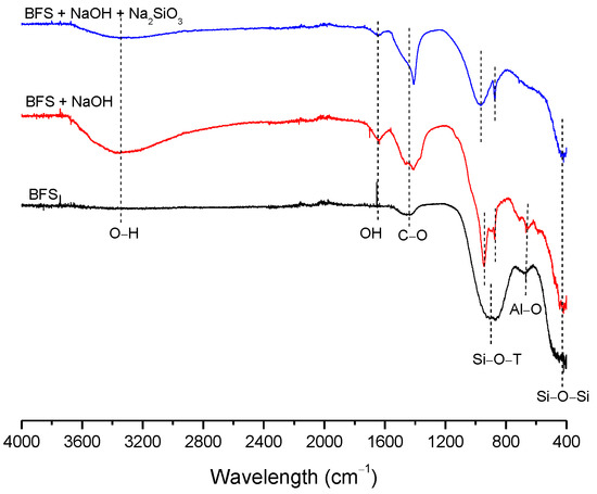The absorption band for BFS-pastes (Figure 8) also exhibits similar behavior to MK-pastes. However, the characteristic band assigned to the Si-O-T bond exhibits a typical shoulder of C-(N)-A-S-H product resulting from high calcium precursor activation. It is also worth noting that the bands are stronger on BFS activation and there is a band at about 1500 cm−1 associated with O-C-O bonds and possible carbonation of activated samples. Another difference between the precursors is the absence of the band around 800 cm−1 assigned to the Si-O bond, and the presence of the band around 700 cm−1 associated with the Al-O bond in the precursor which becomes lower in the alkaline activation. This change occurs as a result of precursor dissolution and reorganization from aluminum bonds.