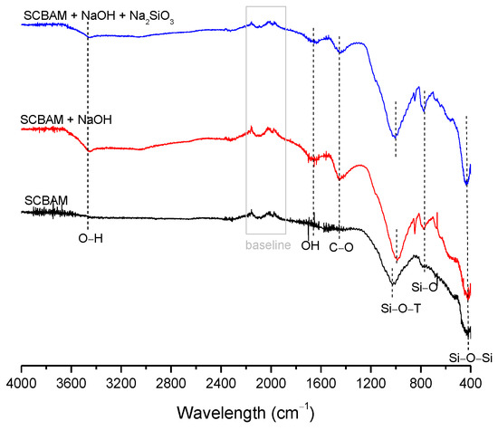SCBAM-pastes (Figure 9) exhibits the bands assigned to hydrated products for both types of activators. The bands assigned to C-O-C, Si-O-T, Si-O, and Si-O-Si bonds exhibit similar behavior to MK. However, the characteristic band around 800 cm−1 associated with the Si-O bond exhibits an increase of intensity through activation, which is only observed for SCBAM-pastes. This band could be assigned to the formation of N-A-S-H in the paste samples. The presence of the band related to hydrated products could indicate that alkaline activation is effective for SCBAM.