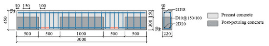 The details of the concrete and reinforcement for the PC beam: side view (unit: mm).