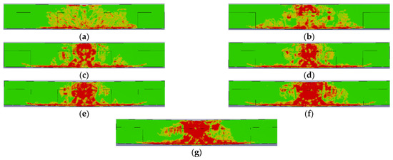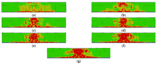 Equivalent plastic strain contours under different lengths of the bonded steel plates: (a) B-h2100; (b) B-h2250; (c) B-h2400; (d) B-h2550; (e) B-h2700; (f) B-h2850; (g) B-h3000.