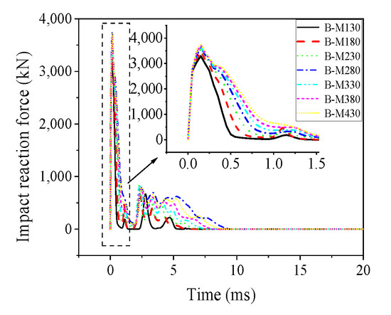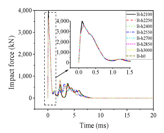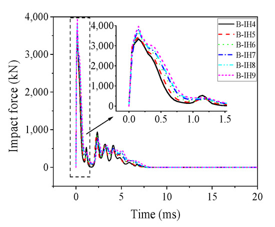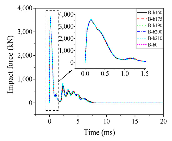 Impact force–time history curves under different lengths of the bonded steel plates.