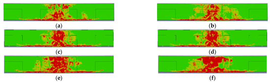 Equivalent plastic strain contours under different impact heights: (a) B-IH4; (b) B-IH5; (c) B-IH6; (d) B-IH7; (e) B-IH8; (f) B-IH9.