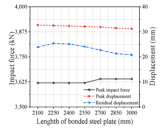 | ID | Length of Bonded Steel Plate (mm) | Peak Impact Force (kN) | Peak Midspan Displacement (mm) | Residual Value of Midspan Displacement (mm) |