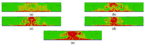 Equivalent plastic strain contours under different widths of the bonded steel plates: (a) B-h2100; (b) B-h2250; (c) B-h2400; (d) B-h2550; (e) B-h2700.