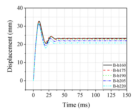Midspan displacement–time history curves under different widths of the bonded steel plates.