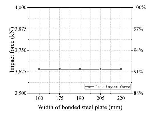Peak impact force characteristic values under different widths of the bonded steel plates.