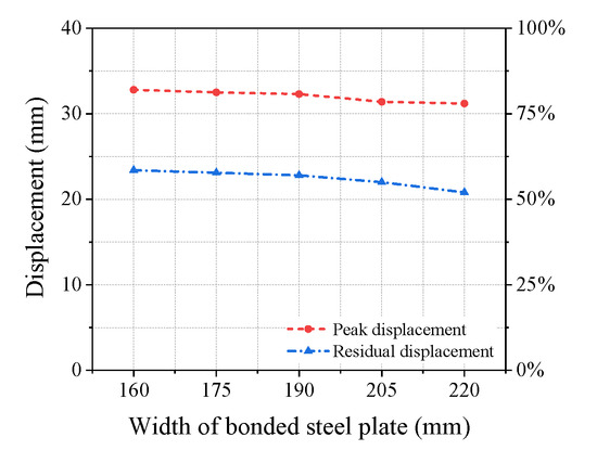 Peak displacement and residual displacement characteristic values under different widths of the bonded steel plates.