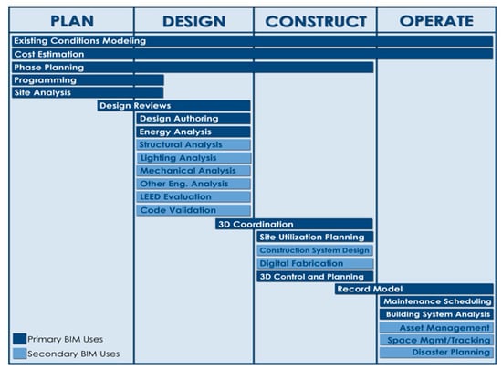The implementation of BIM practices highlights many benefits for all members of a project team; nonetheless, current practices within the AEC industry are not formatted to facilitate integration between the distinct project phases (design, construction, and facility management). Moreover, Figure 1 clarifies the potential that BIM has in the movement from one stage to another, such as “3D coordination”, which is very important for moving from the design stage to the construction stage [].