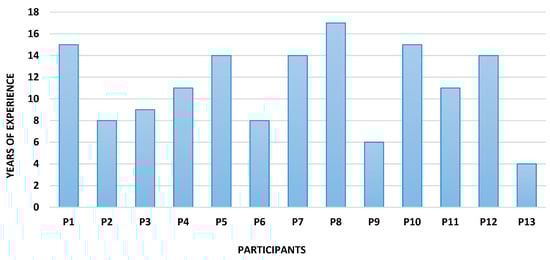 The obstacles in the communication process and the methods that the project partners used to communicate were discussed in the fourth section. This section also explores the coordination process by looking at the roles of other engineering disciplines, such as electrical and mechanical, in the design procedure. The potential of building information modeling (BIM) is explored in further depth in the fifth section. There is some talk about how BIM can be used effectively, and at what point in the design process it makes the most sense to start using it. Feedback on BIM’s usefulness as a design tool and suggestions for enhancing the design process were also collected in this section. According to the interview samples, all participants were BIM experts with a high level of professional experience in BIM implementation at their organizations, as shown in Figure 3. The snowball technique is used, in which an interviewee recommends another interviewee to participate in the study. Interview requests were sent to 39 people, and 13 of them accepted to participate in the study (Table 1). In addition, four samples were invalid because they did not meet the criteria.