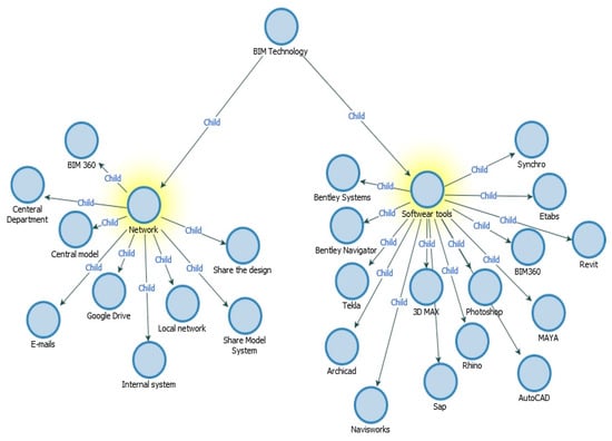 After reading extensively the interview transcriptions, the opening codes were identified. Then, the relationships among those codes were stated, as they were linked with each other. As shown in Figure 4, the “Software tools” and “Network” are axial codes generated from the relations of the opening codes. Based on Bilal’s classification, “BIM technology” has been chosen as a selective code to include all the codes []. The data gathered covered the software tools being used during the design stages to assess the current level of technological advancement and the network systems of BIM implementation during the design process.