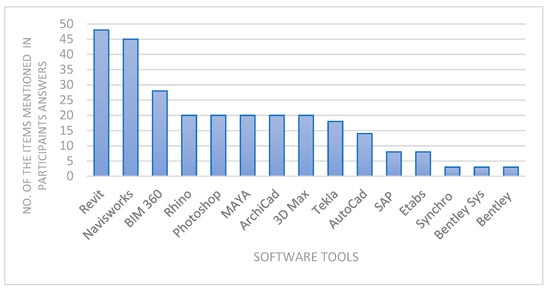 Three-dimensional MAX, Archicad, AutoCAD, Bentley Navigator, Bentley Systems, BIM 360, Etabs, MAYA, Navisworks, Photoshop, Revit, Rhino, Sap, Synchro, and Tekla are software tools used by participants during the design stages. Nevertheless, a large number of respondents used Revit and Navisworks, Figure 5. An explore diagram was generated separately for each node in NVIVO to identify the most frequent codes used by the participants. It revealed that the highest frequency of reference codes are Revit and Navisworks. The reason behind choosing Revit and Navisworks is mainly due to their interoperability. Navisworks is a very useful software, whereby it provides visualization walkthroughs, clash detection, and also allows tolerance to be set to filter soft clashes.