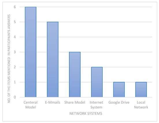 It is observed that each participant has adopted different kinds of collaboration platforms, such as local networks, internal systems, e-mails, central models, BIM 360, and share model systems. Participants (13 and 3) claimed that there is no common BIM collaboration platform. The software has been rejected due to the reluctance of the team members to change their operating system. Nevertheless, the team has developed its management system to suit its own needs. While four firms stated that their network platform consists of the cloud, email, or Google drive, where all projects’ data is stored on the server, and is only accessible within the firm’s premises. In addition, the cloud has been used for information exchange among the disciplines for external projects. Furthermore, major clashes or modifications highlighted during the meetings are sent to all relevant parties through email. Finally, nine firms uploaded information to the company’s intelligence system’s project portal to enhance better collaboration among project stakeholders. The project portal is accessible by project stakeholders from anywhere, at any time. The central model is the most common network platform between all parties due to its accessibility (Figure 6).