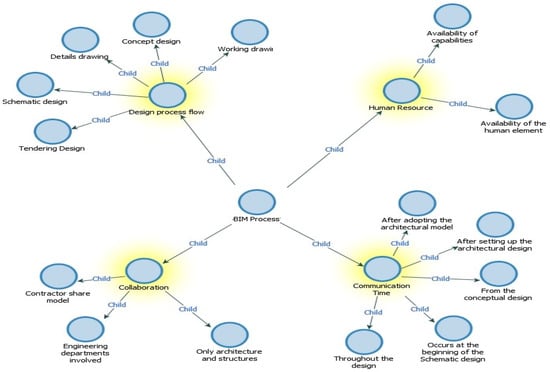 The analysis of the data in this section focuses on the BIM adoption process. The opening codes were generated after reading the transcriptions of the interviews. After linking the opening codes with each other, four axial codes were developed from the relationships between the opening codes represented in the design process flow, communication time, collaboration, and resources. According to [] classification, the BIM process was selected to include all the mentioned codes, as shown in Figure 7.