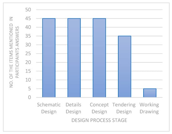 In addition, there are two complementary stages, according to some participants, represented in detailed drawings and tendering designs. In general, the design stages depend on the nature of each participant’s firm and the timeshare in this process. For example, Participant 1, who is a contractor, stated that his role begins late in the design stage, during the tendering stage. Therefore, he believes that it is better to participate early in the design stages from the beginning to enhance his ability and avoid many problems related to the lack of information during the construction phase.