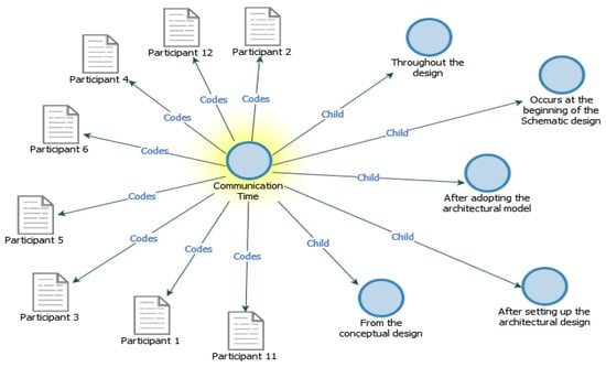 Communication time refers to the coordination between different project parties to share their model during the design process. Based on the participants’ answers about their communication time with each other, all participants confirmed the involvement of all parties from the early design stages. Participant (12) stated that during the design stage, they share all files through the central common data created by the BIM manager, and this occurs from the conceptual design to the detailed design. Participant (4) stated that communication takes place after adopting the architectural model. In addition, other participants mentioned that communications take place after setting up the architectural design and starting the rest of the designs, whether structural or electrical, etc. (Figure 9).
