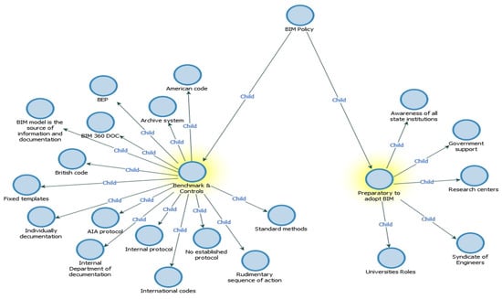 This section reviews the BIM policy implementation through the participants’ responses. Opening codes were created for each other, and the relationships between the open codes were identified. Two axial codes were developed from the relations of participants’ responses represented in benchmarks and controls and preparatory to adopting BIM, as shown in Figure 10.