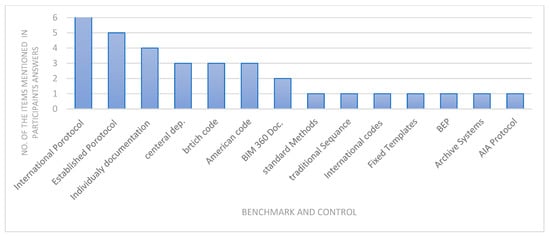 Document control and information management were very important processes to avoid adverse effects on the project. The interviewees’ answers revealed that not all of them have a documentation system in their firms or a specific protocol. Participants 1, 2, 4, 10, 11, and 13 stated that internal protocols and individual methods of documentation were used. Moreover, Participant 5 stated that BIM models were the source of information and documentation, which ensures a maximum degree of communication between all parties. Meanwhile, Participant 12 stated that documentation was performed according to international codes, such as the British code or the American code, with some modifications to match the nature of work in the Middle East. Participants 3 and 9 mentioned that the AIA and BEP protocols were used as documentation methods for all drawings, memos, and other project documents. As shown in Figure 11, the internal protocol is the most common coded reference used by different firms.