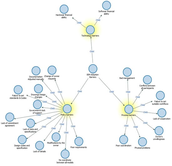 This section aims to find out the barriers to adopting BIM during the design stage. The interviewees, in their answers, described the design barriers they face based on their specialties. It is observed that similar design problems were stated by 10 participants. Opening codes were created and linked to each other; the relationships between the open codes were identified. Three axial codes were developed from the relationships represented in the technology barriers, process barriers, and policy barriers to adopting BIM, as shown in Figure 12.