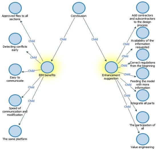 The remarks and comments explained by the participants align with what was reported in previous literature on the benefits of BIM. After reading the transcripts of the interviews extensively, the opening codes were created and linked with each other. Two axial codes were developed from the relationships of previous opening codes, as represented in the BIM benefits and enhancement suggestions. The interview conclusion was selected as a selective code according to the acceptable classification to include all the above codes, as shown in Figure 14.