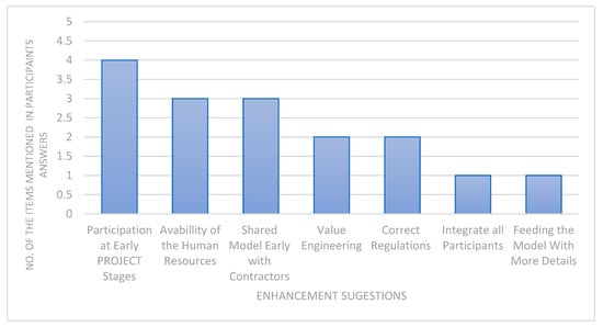 This research aims to enhance the adoption of BIM during the design stage by assessing the problems of the current work system and providing a solution for them. The respondents’ suggestions to enhance the adoption process were captured. In the code’s frequency diagram, the highest frequency of reference codes is the participation of all project departments, as shown in Figure 15.