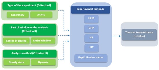 This review paper aims to investigate the experimental methods that can determine a window’s U-value following two main steps. First, we examined the main available standardized experimental methods that have been introduced specifically for windows/glazing systems or the standardized methods whose main focus was not on the windows but on adapting and applying window characteristics by other researchers. Second, we looked into the novel experimental methods developed by researchers and whether or not they were based on the main concepts of the available standardized methods. As illustrated in Figure 1, three main criteria were considered for each experimental method: Criterion I which is related to the type of test in terms of boundary conditions (laboratory or in situ); Criterion II, which deals with the part of the window that was analyzed (only the center of the glazing or the entire window, including the edge and frame); and finally, Criterion III, which is related to the data analysis method (steady-state or dynamic).