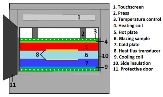 Standard ISO 10291:1994 [54] (or EN 674:2011 [55] as stated by [56]) provided a method for determining the steady-state U-value of the central part of multilayer glazing using the guarded hot plate method [57]. According to the standard, and with the help of the apparatus, the surface-to-surface thermal resistance (R-value) of multiple glazing could be calculated via the following equation: