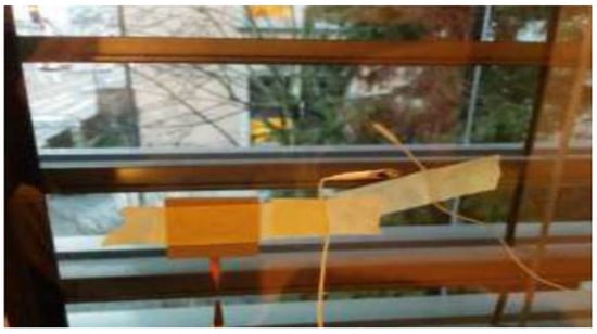 In a case study conducted by [44], based on the average method represented by ISO 9869-1:2014 [35], the U-value of the central part of the glazing of an existing double-glazed window with a PVC frame was measured with the help of a gSKIN heat flux sensor, two temperature sensors, a data acquisition system, and greenTEG software (V1.00.03). Three night-time measurements (starting a couple of hours after sunset and ending early in the morning) were taken to avoid the impacts of solar radiation. However, to analyze the impact of solar radiation on the U-value of the glazing, an additional daytime measurement (starting in the morning and ending in the early evening before sunset) was also carried out. As shown in Figure 4, the heat flux sensor was attached to the inward-facing surface of the inner pane with a temperature sensor attached next to it, approximately 3–5 cm from the window surface. Another temperature sensor was placed in the same location but on the other side of the window. The U-values that were obtained from the three subsequent night-time measurements were very similar, differing between 2.09 and 2.11 () with a difference of less than 1%. The standard deviation for each of the measurements was less than 5%, showing their compliance with ISO 9869-1:2014 [35]. Therefore, it was concluded that a measurement time of only a few hours was enough to provide a reliable U-value. However, the daytime measurement showed a high deviation (almost 18%) from the average night-time measured U-value, together with a higher standard deviation (21.1%) compared to the night-time measurements’ results. The unreliability associated with the daytime U-value measurement was mostly attributed to the impact of solar radiation, i.e., at some times of the day, the heat loss from the inside to the outside due to temperature difference could be completely offset by the solar heat transmittance.