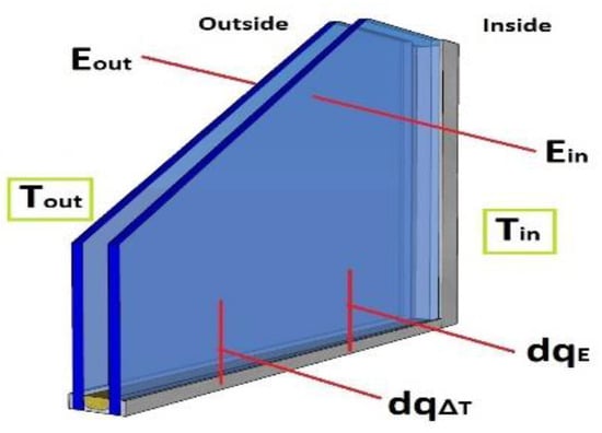 Schematic representation of energy flows and relevant nomenclature: E_{out} (W·m−2) is the global (on vertical plane) impinging solar irradiance measured by a thermopile pyranometer; E_{in} (W·m−2) is the global (on vertical plane) transmitted solar irradiance into the room measured by a thermopile pyranometer; dq_{\mathrm{\Delta T}} (W·m−2) is the heat flux towards the interior due to the thermal gradient between outside and inside; dq_E (W·m−2) is the heat flux due to absorbed solar radiation. Adopted from Goia et al. [24].