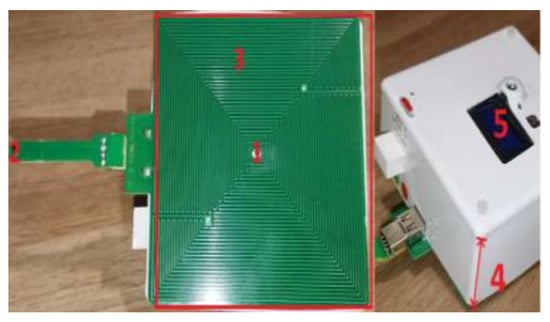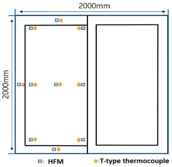 In another study conducted by Park et al. [11], the U-value of an entire double-glazed window was determined using the HFM method. For this, the heat flux sensors, and the accompanying thermocouples were attached to the central part of the glazing at one point, to the edge of the glazing at six points, and to the frame part at three points (see Figure 6).