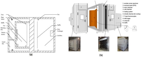 The calibrated apparatus consists of two main parts, the metering box (the hot room) and the cold box, which are both made from insulation materials and prevent heat transfer between the device and the external environment [25,30,70] (see Figure 9b). The external environment should be ventilated to maintain the desired temperature and to keep errors associated with the apparatus to a minimum; however, its temperature does not necessarily need to be the same as the hot room [63]. The test specimen was placed in the aperture of a surrounding panel facing the hot box on one side and the cold box on another side. The chambers were equipped with fan systems to prevent thermal stratification [71]. The measurements were taken once the temperature in each box was stable. To determine the heat loss through the metering box walls, heat transfer through the surrounding panel, and the flanking losses, several calibration tests needed to be carried out under a wide range of environmental temperatures before the main test. This required the help of calibration panels with a known thermal resistance range [25]. With the knowledge of the box and marginal heat losses, the amount of heat that passed through the test specimen could be quantified [30].