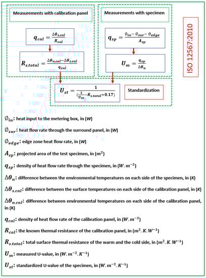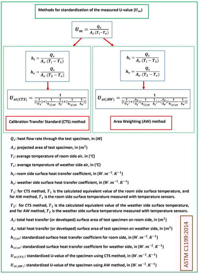 In addition to the above-mentioned standards, there are two significant standards that have been specifically prepared to determine the U-value of fenestration systems using the HB method; they are standard ISO 12567:2010 [72] (mostly used in Europe) and the American ASTM C1199:2014 [64]. In both standards, the measured U-value (, in ) was obtained by dividing the density of the heat flow rate through the specimen, in (), and by the temperature difference between the two sides of the specimen, in (K). However, in ASTM C1199:2014 [64], the temperature difference between the two sides of the specimen refers to the average air temperatures, while in ISO 12567:2010, it refers to the environmental temperatures (including the radiation impact). For the purpose of rating and comparing the results of the HB methods (followed by different standards) with each other and/or with the theoretical and simulation results, the U-value measured by the HB method needed to be standardized by correcting them with the standardized total surface thermal resistances (for ISO 12567:2010), or with the standardized total surface heat transfer coefficients (for ASTM C1199:2014) [73].