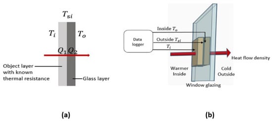 To determine the thermal and optical characteristics of a glazing system under real operational conditions, Goia et al. [24] developed a simple non-calorimetric method with relatively cheap equipment. This included sets of temperature sensors, heat flux meters, pyranometers, and a data acquisition system, which could be installed in real buildings or test cells. The proposed method was based on measurements of temperatures, heat fluxes, and solar irradiance values (for determining the g-value which is beyond the scope of this study). Figure 5 illustrates the energy flows and the parameters that were measured in the method. The U-value was evaluated by linear regression, conducted by the ordinary least squares method. With the help of night-time measurements (to avoid the impacts of solar radiation), the U-value was determined using the following equations: