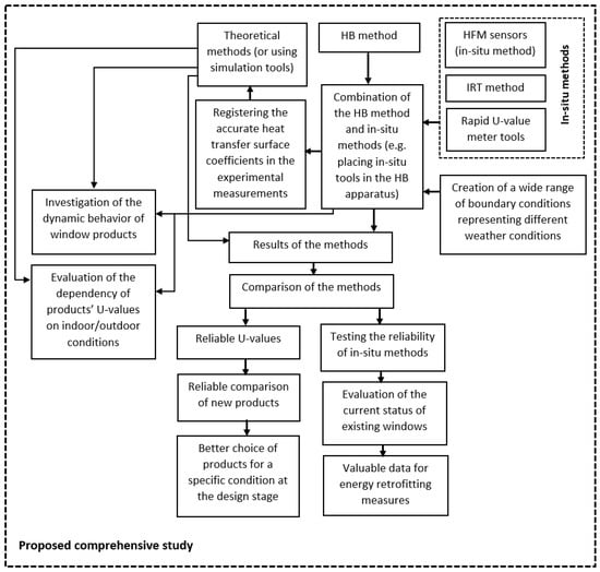 The methods reviewed here for the U-value include the heat flow meter (HFM), guarded hot plate (GHP), hot box (HB), infrared thermography (IRT), and the so-called rapid U-value meter. In the end, a set of challenges were identified to provide more comprehensive, realistic, and reliable tests for the future. Figure 2 illustrates the study concept framework.