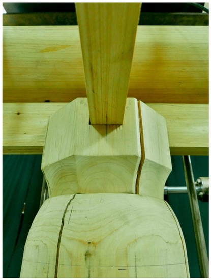 22]. According to the observation of the specimens’ failure, the cracks can be attributed to the shear force in the plane of the timber frame. So far, there has been a lack of specific experiments on or assessments of the mechanical properties of this joint.