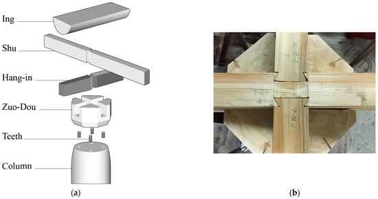 5]. The test takes the roofing load into account. The testing results demonstrate that the primary structural response of the frame is the rocking of the columns. Relatively, the pediment composed of a large amount of Dou, Gong, and Shu reveals subtle deformation. Thus, the early failure normally occurs in the connection of the column and the Tong, as well as column’s top and Zuo-Dou. Based on a field investigation and a series of tests, Yeo indicates that the Zuo-Dou is vulnerable under vertical and horizontal loads. [