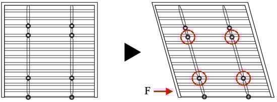 Figure 4. In this figure, letter “F” refers to the force caused by the earthquake and red circles indicate the positions of Zuo-Dou connections. While the elements cross-intersecting in the centre refer to the wooden beams or Shu in the Dieh-Dou frame, the three perimeter components are masonry walls. Macroscopically, the in-plane angle of the horizontal elements over the Zuo-Dou changes. Microscopically, the relative movement of the associated components in the Zuo-Dou generates. Yeo delineates the deformation and potential cracks of the Zuo-Dou, as can be seen in