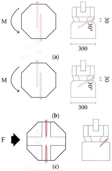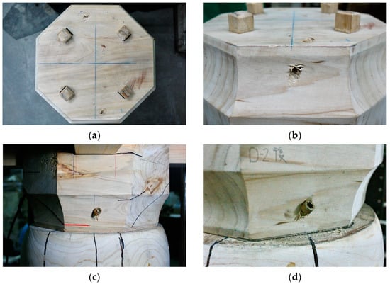 Figure 6. Conceptually, the bamboo nail is applicable as a shear-constraining peg because of its transversal resilience, whereas the STS is favourable as a moment-constraining fastener owing to its longitudinal resistance. Like the traditionally used wooden teeth under a Zuo-Dou, the bamboo nail is inserted perpendicular to the column’s wooden fibre and is intended for the restriction of the relative displacement of two components. The effect is similar to that of a shear stud. According to the traditional carpentry, the bamboo nails are normally produced at about 110 mm, which is around 4 traditional inches in Far East Asia. The STS can provide a reaction for the joint by means of its withdrawal strength. With the proper length and angle, the STS contributes to the generation of a counter moment to constrain the rotation. To make the STS penetrate half of the diameter of the round column or the diagonal of the octagonal Zuo-Dou, which is about 300 mm in this study, the STS is supposed to be 200 mm in length. Meanwhile, the angle of the STS must be determined. According to the different directions of the wooden fibre of the associated elements, e.g., the column and the Zuo-Dou, the inserting angle of the STS is about 30° to the interface. The installation of the STS must prevent the probability of a parallel-to-wooden-fibre configuration as far as it possibly can. This angle also takes the curvature of the Zuo-Dou into account. During drilling, the STS remains at a tangential angle to the arc surface of the bottom of the Zuo-Dou, making the screw’s pointed end stable. The layout of the STS and the Zuo-Dou is illustrated in