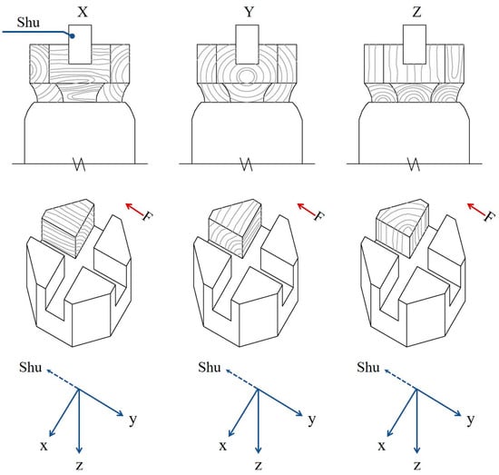 Regarding the geometric layout, this study comprises certain variables for each factor, and the variables’ discrepancy reflects the realistic conditions of the wooden cultural heritage in Taiwan. The first geometric factor is the fibre’s orientation of the Zuo-Dou connection; it comprises three categories, named X, Y, and Z. According to the ideas of the carpenters, who were interviewed and invited to manufacture the specimens for this study, the wooden fibre of Zuo-Dou is supposed to be out of the plane of the Dieh-Dou frame and perpendicular to the Shu, which is the X-direction, as shown in
