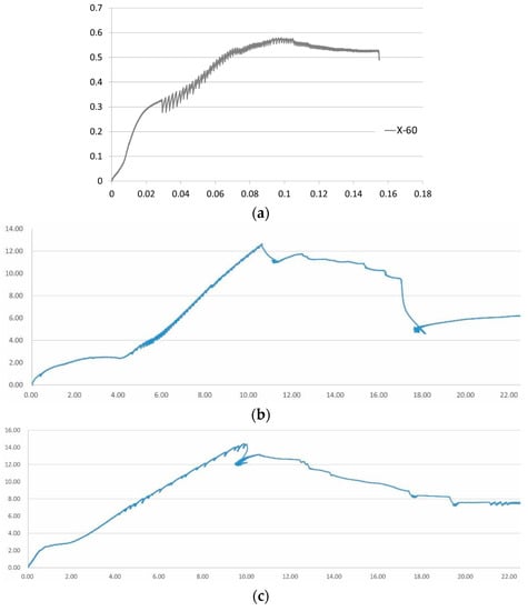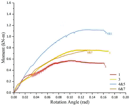 Figure 12 demonstrates some curves of the testing in this study. The layouts of the curves do not show consistent or congruent patterns. This divergency can be attributed to the friction, tightness, and rigidity of the elements, as well as their interface. Therefore, the calculation and the evaluation of the testing results are not based on certain equations. Instead, the yield point and stiffness are determined according to the curves themselves. Firstly, the analyses have to determine the yield point. Regarding the curves with a certain vibration in the later phase of testing, the yielding moment or shear force is the point before the significant slump occurs. As far as the curves with multiple turning points are concerned, the first turning point is chosen as the yielding reaction. Mainly, the first turning point arises at the phase where the curves become flat. Secondly, the stiffness can be calculated based on the yielding and the starting points of the testing. The estimation of the stiffness directly refers to the line between the yielding and starting points of the testing curves. Normally, this strategy leads to a conservative stiffness result, owing to the relatively gentle slope between these two points. Finally, the ultimate moment or load is determined according to the highest points of the curves.
