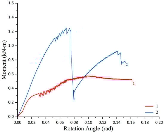 Figure 13 comprises only the STS drilled by the moment-constraining scheme. The difference between their moment-rotation curves demonstrates that the structural response after yielding is influenced by the alternative fasteners, i.e., the STSs. While the original wooden teeth in specimen No. 1 cause high-frequency slippage or significant vibration, the STS in specimen No. 2 results in a gentle zigzag. Only one tremendous drop of the curve is generated in specimen No. 2. This can be attributed to the sudden release of the bonding behaviour between the wooden components and the STS. Without the wooden teeth, such extraordinary slippage cannot be restricted constantly. Nevertheless, the resistance of the Zuo-Dou connection rehabilitates, and the gentle deformation remains.