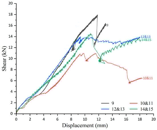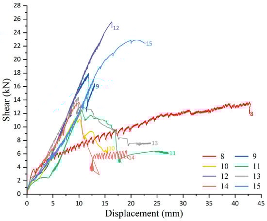 Figure 17 demonstrates that all eight specimens exhibit different patterns of curves and divergent performance. As the same type, specimen No. 12 exhibits greater yielding and ultimate resistance, while specimen No. 13 possesses higher shear stiffness. Meanwhile, their curves reveal different outcomes. As far as specimens No. 14 and 15 are concerned, the former shows brittle behaviour and the later exhibits a resilient performance. These phenomena are owing to the complexity of Zuo-Dou connections. Different materials, various interfaces, and uncertain tightness influence the shear behaviour of Zuo-Dou joints. Nevertheless, the connections exhibit considerable ductility owing to the retrofitting techniques based on the STS and the bamboo nail.