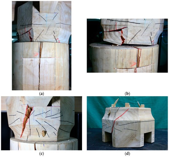 Figure 19c,d depicts the contribution of the bamboo nail. In these two photos, the bamboo nail prevents the Zuo-Dou from block shear failure and does not break under transversal loading. Instead of becoming the plastic hinge, the bamboo nail remains sound, indicating that it deforms resiliently, ensures the contact surface between the bamboo and the wood, and distributes the stress. Finally, the rocking deformation of the Zuo-Dou is alleviated.