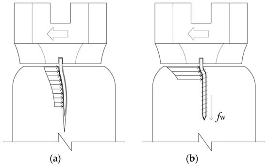 According to the testing results, the bamboo nail’s reinforcing efficiency for yielding and the ultimate shear resistance are more considerable than the STS’s contribution. This can be attributed to not only the transversal strength of bamboo but also the proper contact surface between the bamboo and the wood. While subjected to a bending force, the bamboo nail deforms along with the wooden element, ensuring a sufficient area of contact surface and distributing the stress. Figure 20a illustrates the deformation of the wooden elements and the bamboo nail. Both the materials’ mechanical properties and the friction function and provide the reaction. On the other hand, the STS’s thread and slender shank may cause concentrated and perpendicular stress on the wooden component, limiting the capacity of the entire connection. Figure 20b delineates the distribution of the stress on the wooden column. Because the rope effect (the fw in the figure) of the STS restrains the slippage of the screw, the bending of its handle causes concentrated stress perpendicular to the wooden fibre. Thus, the bamboo nail is structurally feasible in the methods of the shear-constraining scheme against shear force.