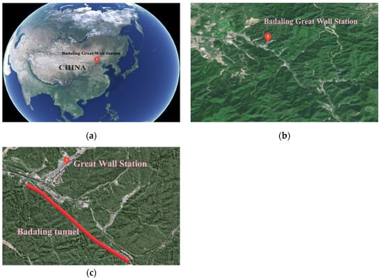 Location of Badaling Great Wall Station. (a) Location in China. (b) Surrounding environment. (c) The relative location of the Great Wall Station.