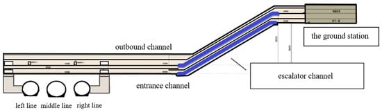 Badaling Great Wall Station is located in the new Badaling Tunnel. Its location is shown in the Figure 1. The total length of the station is 470 m. The underground construction area of the station is 36,000 square meters and the depth between rail surface and ground is 102 m. With many stations and a large number of variable types of caverns, it is a complex underground cave group of stations in China. The underground structure of the station has three floors, as shown in Figure 2, which are platform floor, inbound channel floor, outbound channel floor and equipment cavern. The levels of surrounding rock are mainly III and Ⅴ. The horizontal spacing of the standard tunnel section is 2.27~6 m. The vertical spacing between the platform layer and the passageway layer is 4.55 m. The clear passage distance of the escalator in and out of the station building is 4.1~3.78 m.